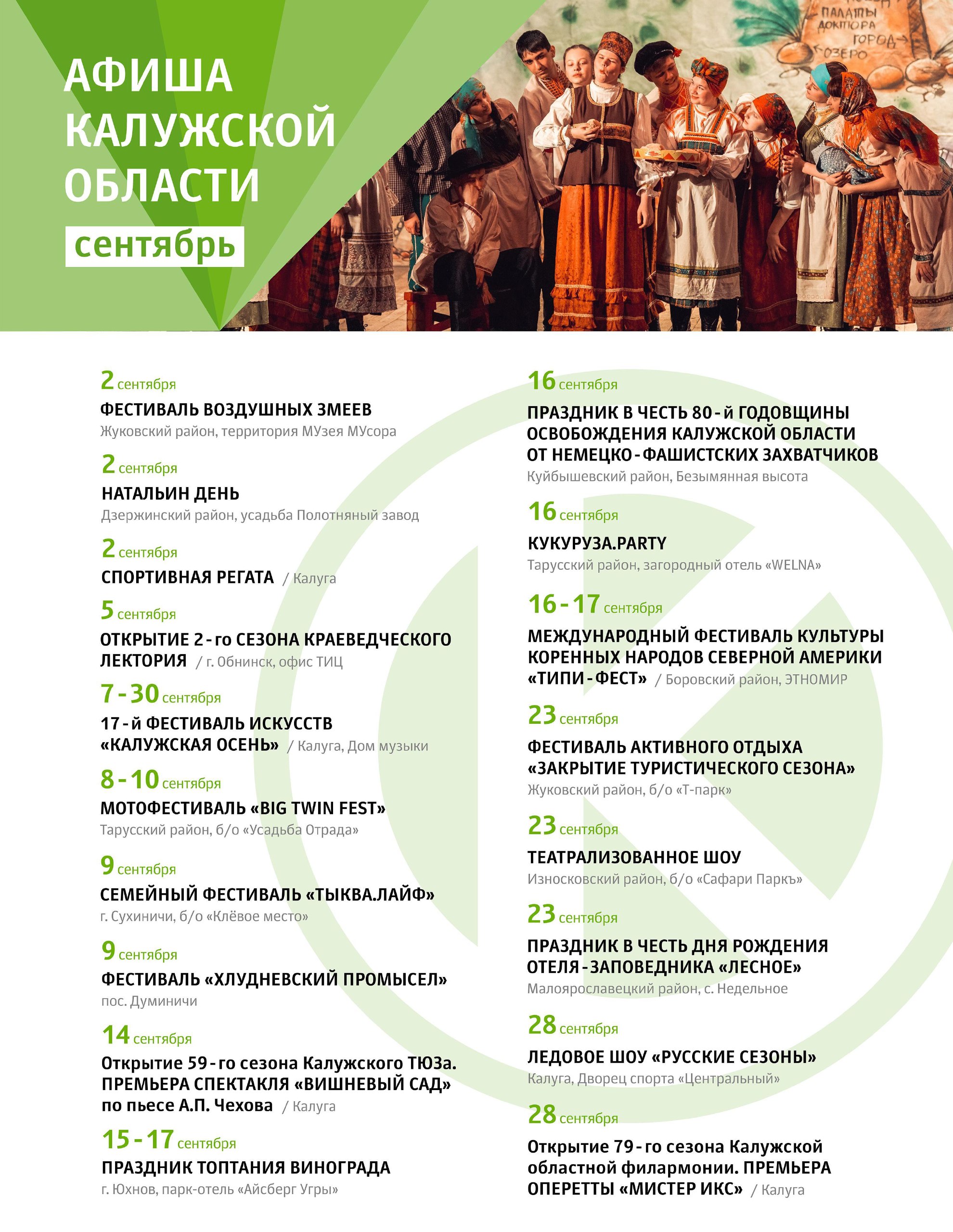 В четверг, 31 августа, в министерстве культуры и туризма Калужской области рассказали о мероприятиях в регионе на сентябрь.