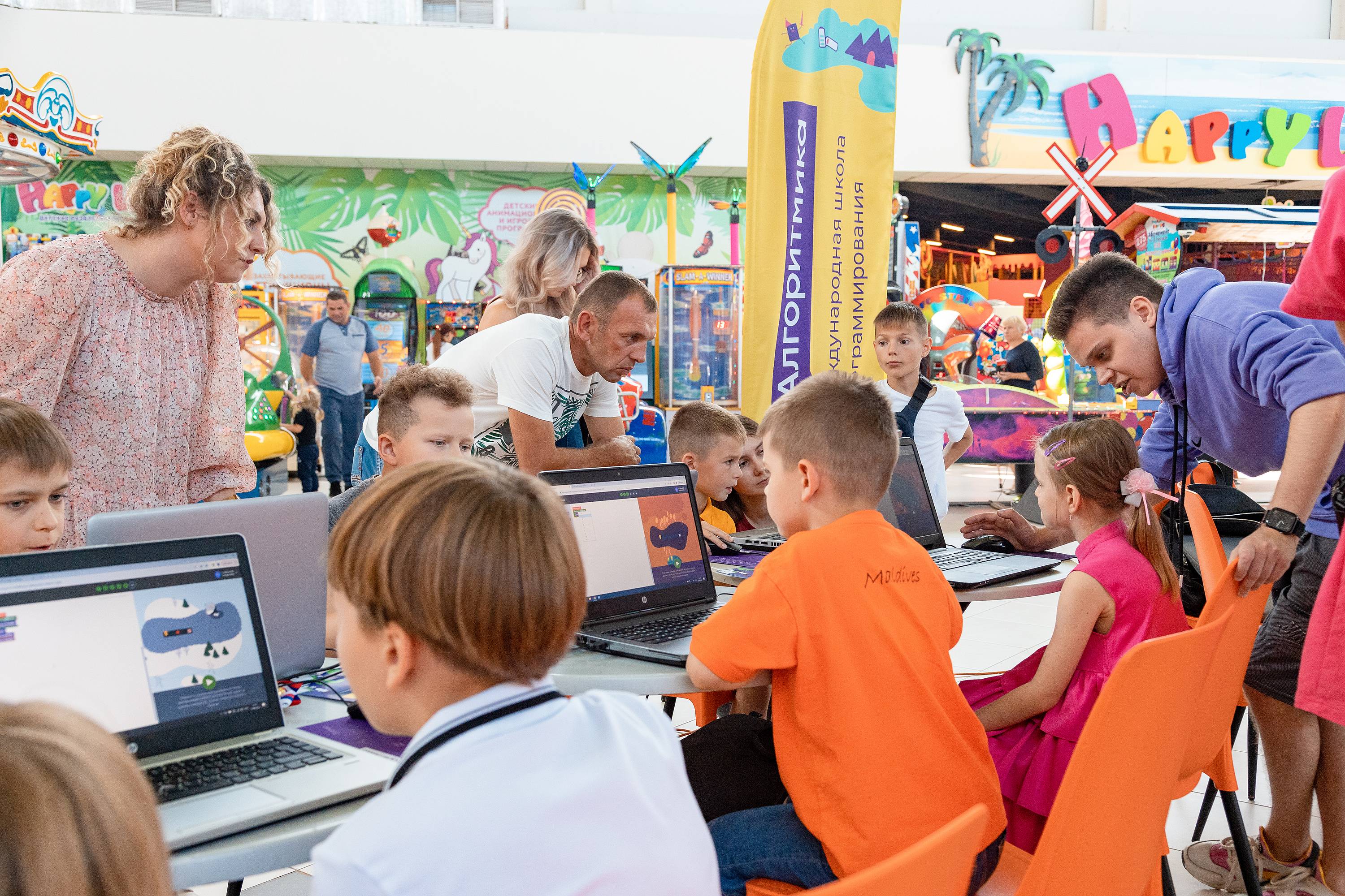 Школа программирования для детей «Алгоритмика» не давала ребятам скучать. Ноутбуки с программами и педагоги, увлеченно рассказывающие о процессе ждали посетителей ярмарки.