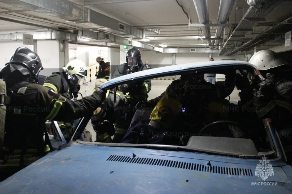 - По тактическому замыслу, от администрации торгового комплекса поступило сообщение, о розливе и воспламенение топлива на площади 120 квадратных, в результате столкновения трех автомобилей на подземной парковке здания, - пояснили спасатели. - Две автомашины загорелись. Двоих человек, зажало поврежденными конструкциями третьего автомобиля. Продукты горения быстро распространились по всему зданию, создав угрозу для жизни людей. Сотрудники комплекса до прибытия пожарных подразделений, организовали эвакуация персонала из помещений.
