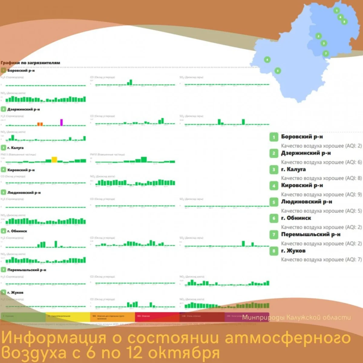 В Калужской области с 6 по 12 ноября система мониторинга произвела 1 644 198 измерений характеристик атмосферного воздуха на 17 автоматических постах наблюдения в восьми районах.