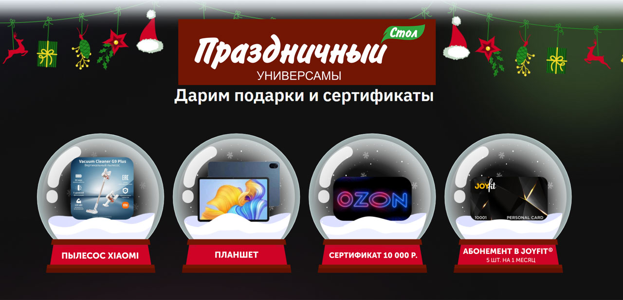 На этот раз универсамы «Праздничный стол» предлагают к розыгрышу «ручку»- пылесос, планшет, сертификат на Озон номиналом 10 тыс. рублей и пять абонементов в фитнес-клуб «Джойфит» на 1 месяц.