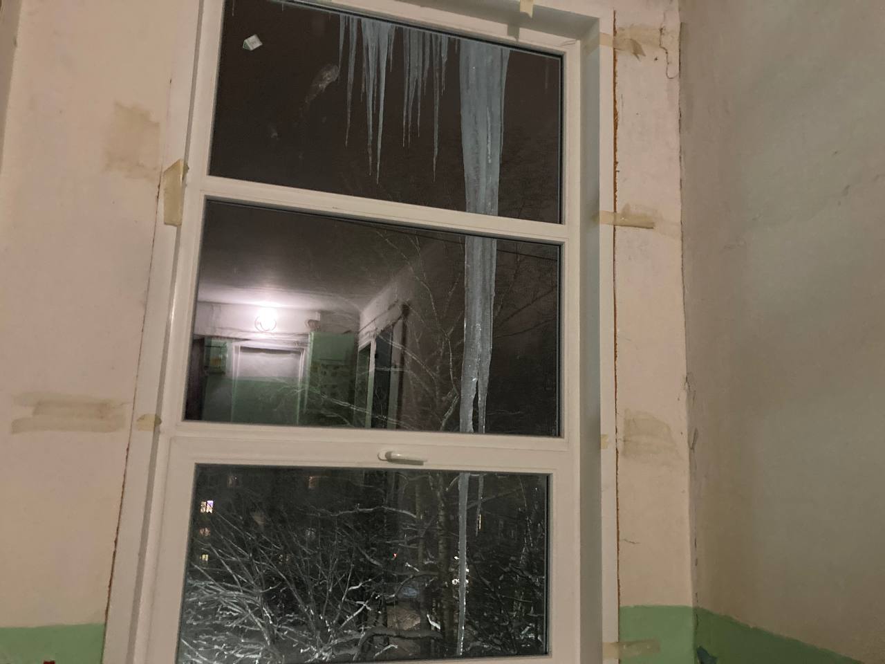 На улице Ольговской сосулька выросла размером с этаж. Жители пожаловались нам, что боятся заходить в подъезд, так как она может упасть в любой момент.
