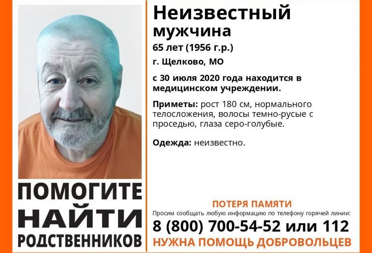Мужчина, 65 лет, город Щелково Московской области, с 30 июля 2020 года находится в медицинском учреждении.
