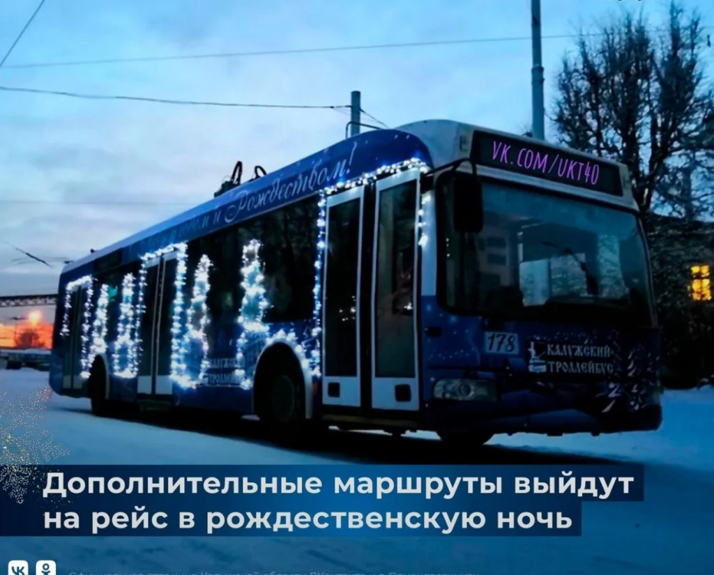 В субботу, 6 января, Правительство Калужской области сообщило, что в ночь с 6 на 7 января в Калуге семь троллейбусов и один автобус отправятся от площади Старый Торг после праздничной службы.