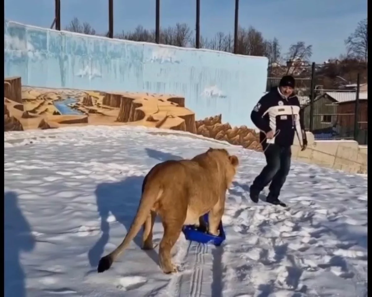 В калужском экопарке пара хищников с интересом играют с большой ледянкой словно маленькие дети.