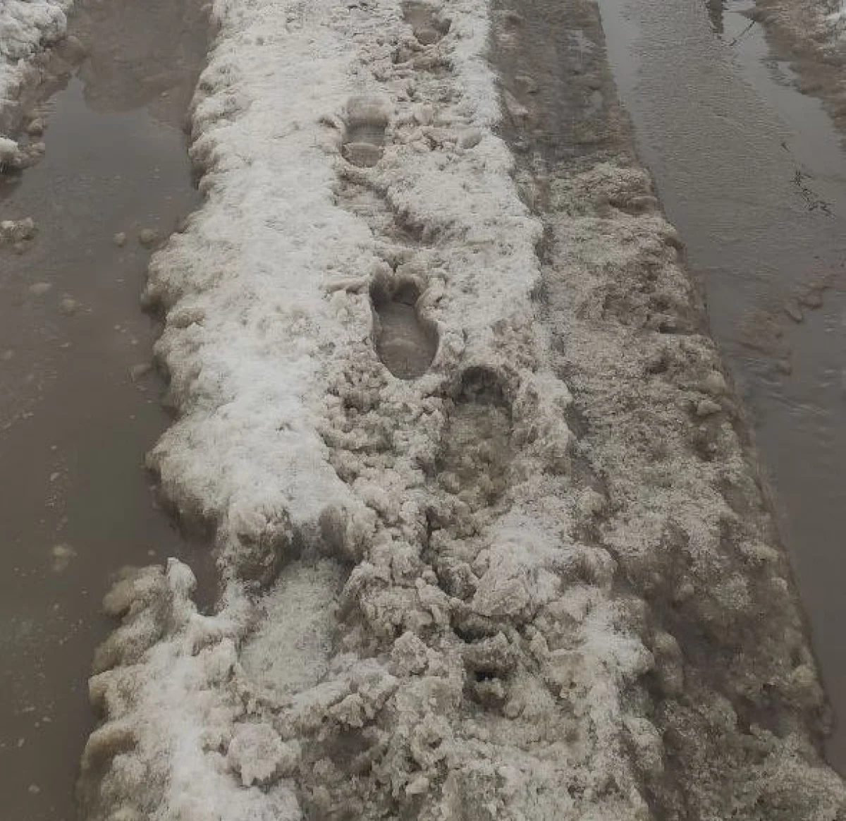 Судя по следам на оставшемся островке снега, калужане осваивают эквилибристику, балансируя на снежной каше между лужами.