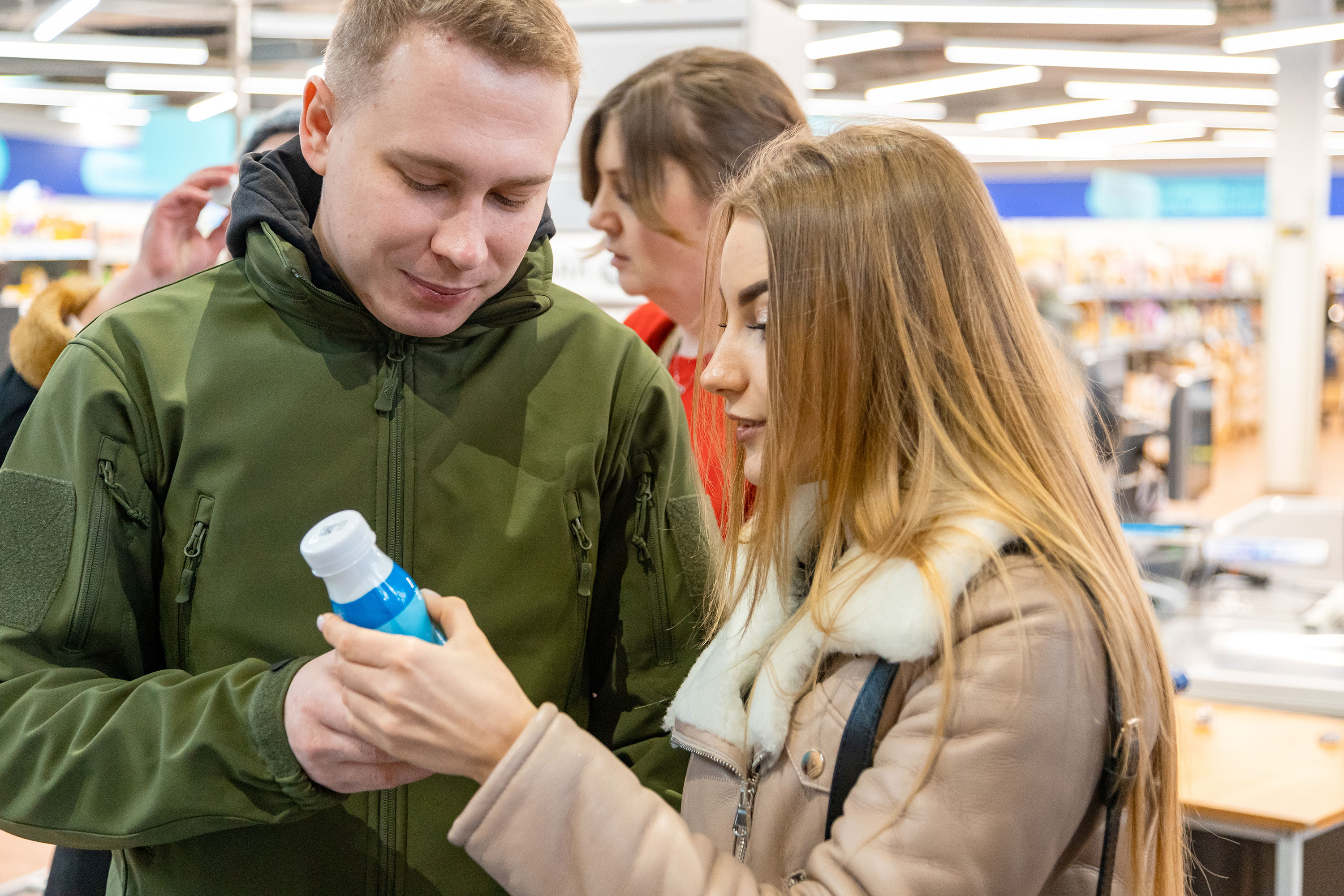 Молодые калужане Алина и Артем пробуют молочную продукцию козельского завода.