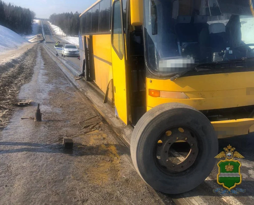 Детей везли из Калуги на соревнования в Тулу на автобусе "Bova". На 801 км дороги Р-132 "Золотое кольцо" водитель заметил, что колесо повреждено.