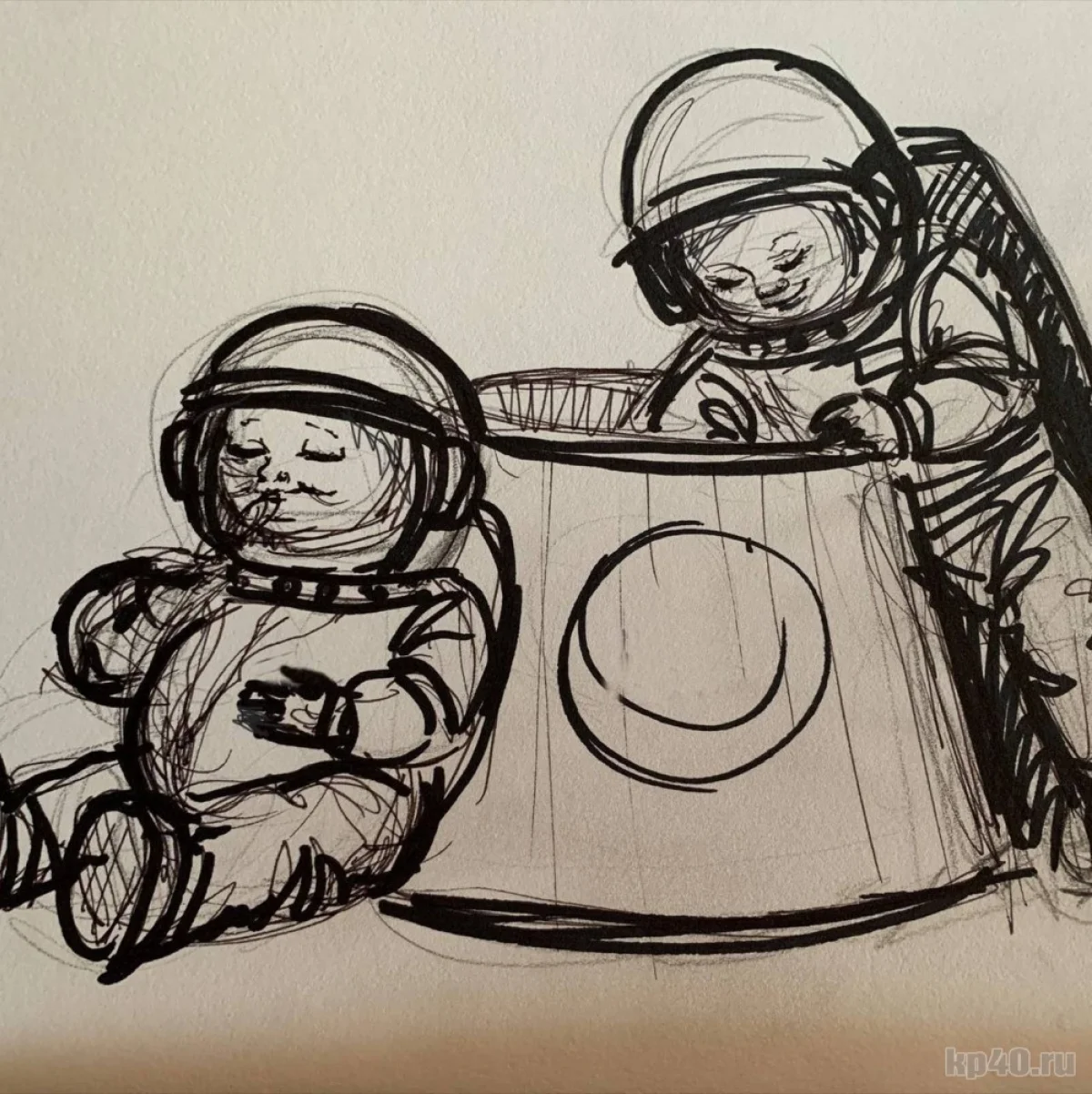 - Слева космонавтик - старший сын Иван, первым добрался до кадки с калужским тестом, объелся, сидит отдыхает, наслаждается, облизывает ложку, - рассказали нам авторы проекта. - Справа младший сын Игорь, добрался до теста позже, поэтому приходится уже со дна доставать тесто.