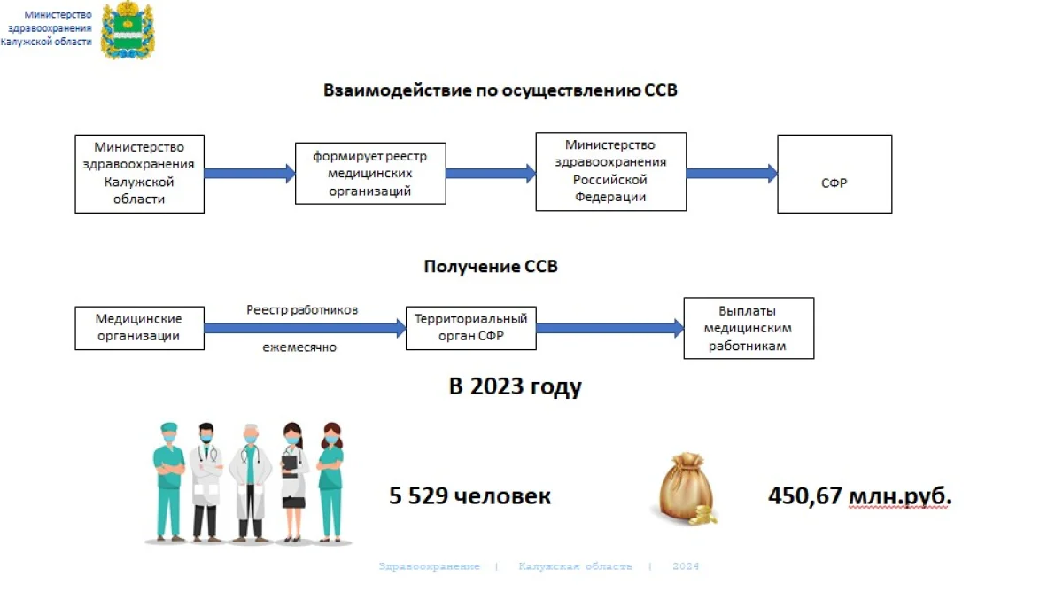 В Калужской области данные выплаты в 2023 году получили 5 529 медицинских работников всех категорий на общую сумму 450,67 миллиона рублей.