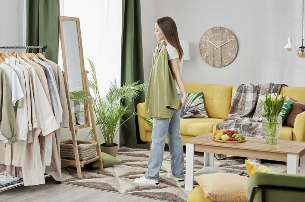 Если вам все же не хватает места для хранения одежды в шкафу, то отличным дополнительным вариантом будет напольная вешалка. Рейл позволяет удобно и эстетично хранить домашнюю одежду и трикотаж. А если подобрать чехлы в одном стиле, то можно разместить даже верхнюю одежду и костюмы. Напольные модели рейлов обычно бывают мобильными, и их можно перемещать по комнате. Если же открытая вешалка будет стоять на одном месте постоянно, то можно дополнить ее полкой для хранения и расставить на ней декоративные коробочки с мелочами.