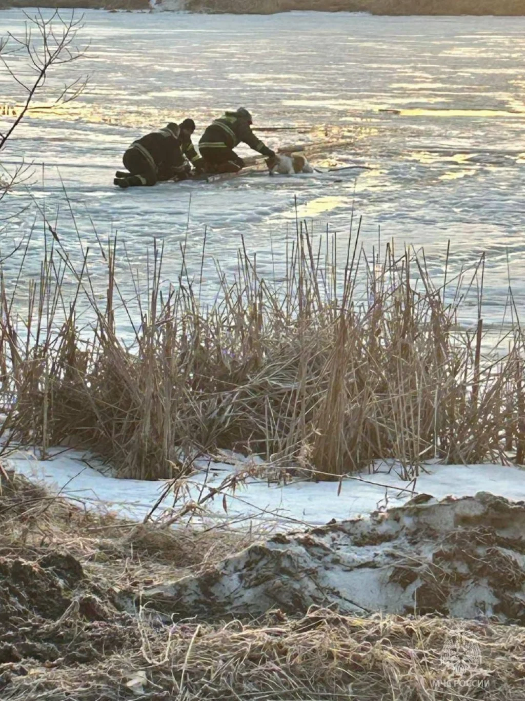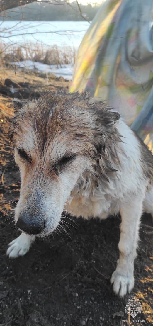 На берегу собака прижималась к своим спасителям, одаривая людей своей любовью и благодарностью. Женщина, которая позвонила в МЧС, накрыла замершего пса пледом.