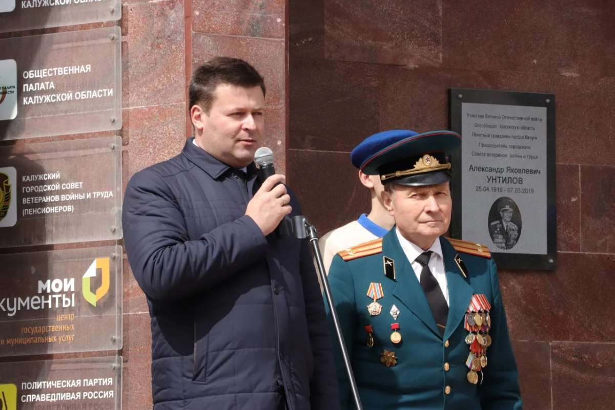 Память фронтовика почтили на торжественном митинге, калужане возложили цветы к мемориальной доске в честь Александра Унтилова.