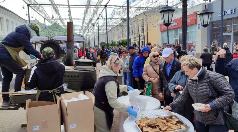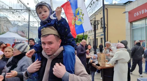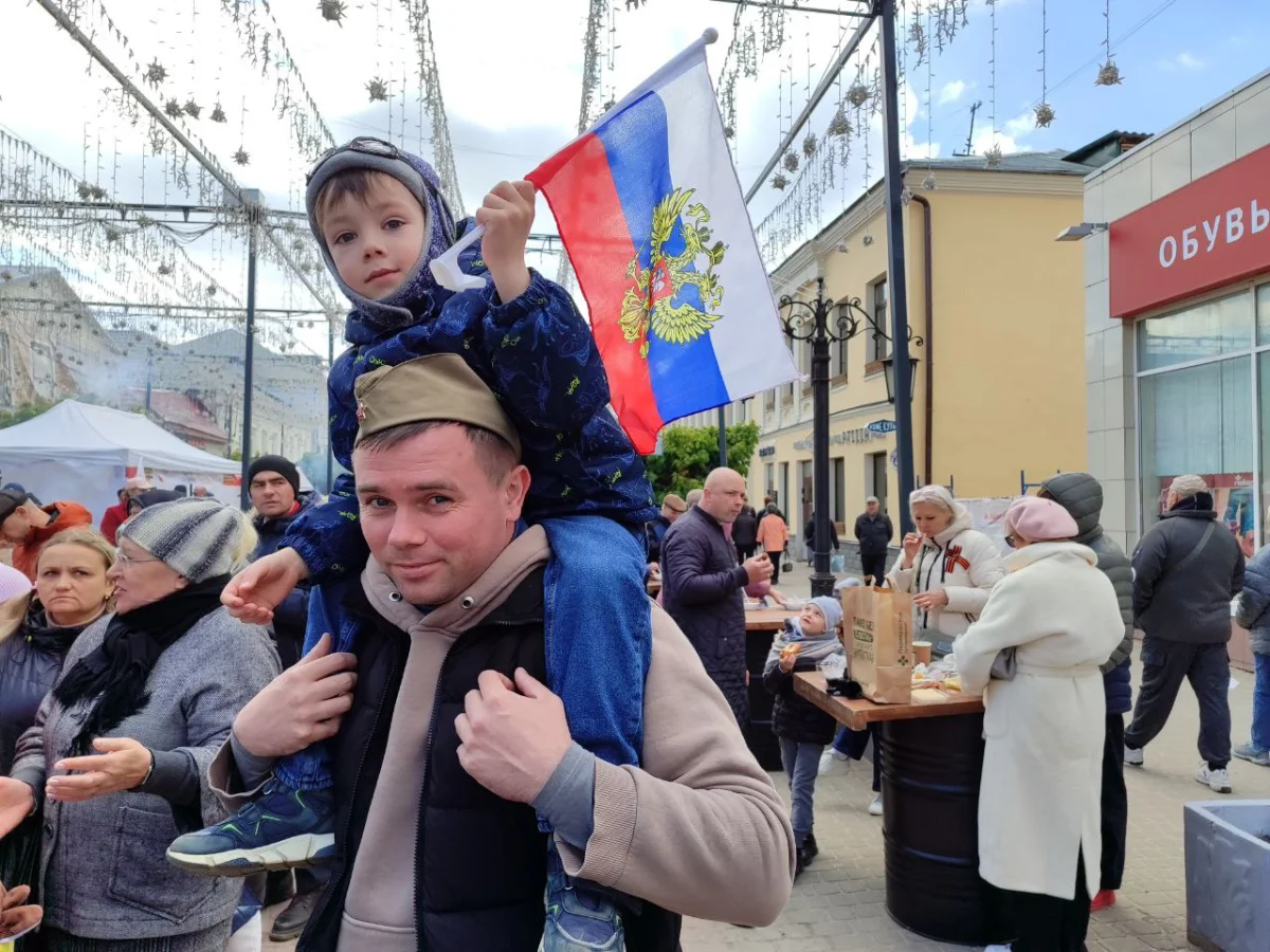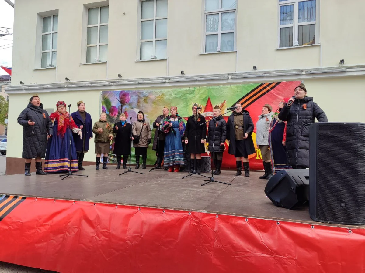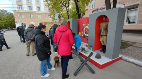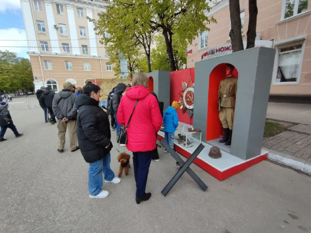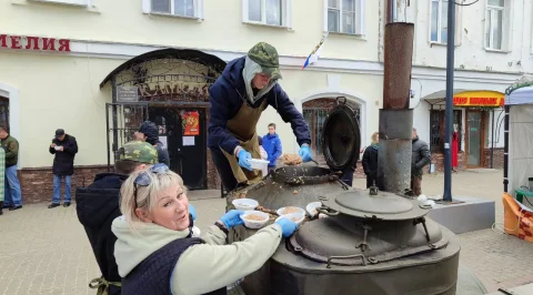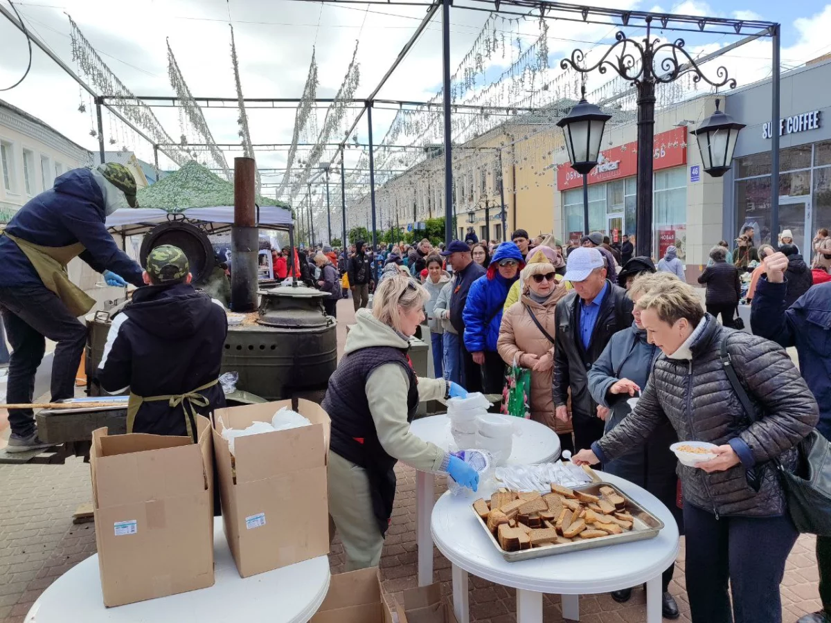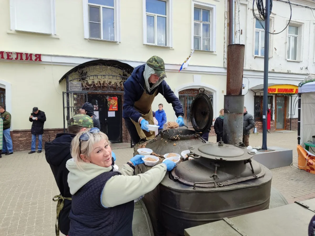 Калужане пришли сюда семьями, принесли портреты своих родных - участников войны. Калужане смотрят выступления, выставки и посещают фотозоны. Танцевальные номера отменили из-за холода, а народ согревается горячей солдатской кашей.