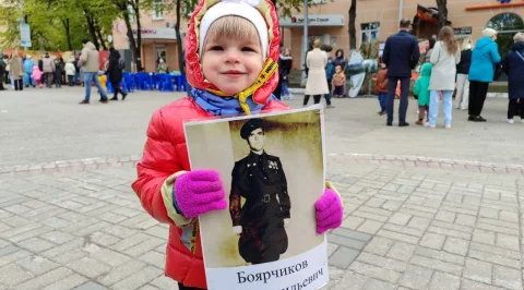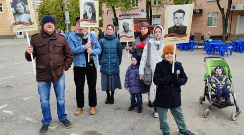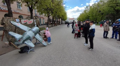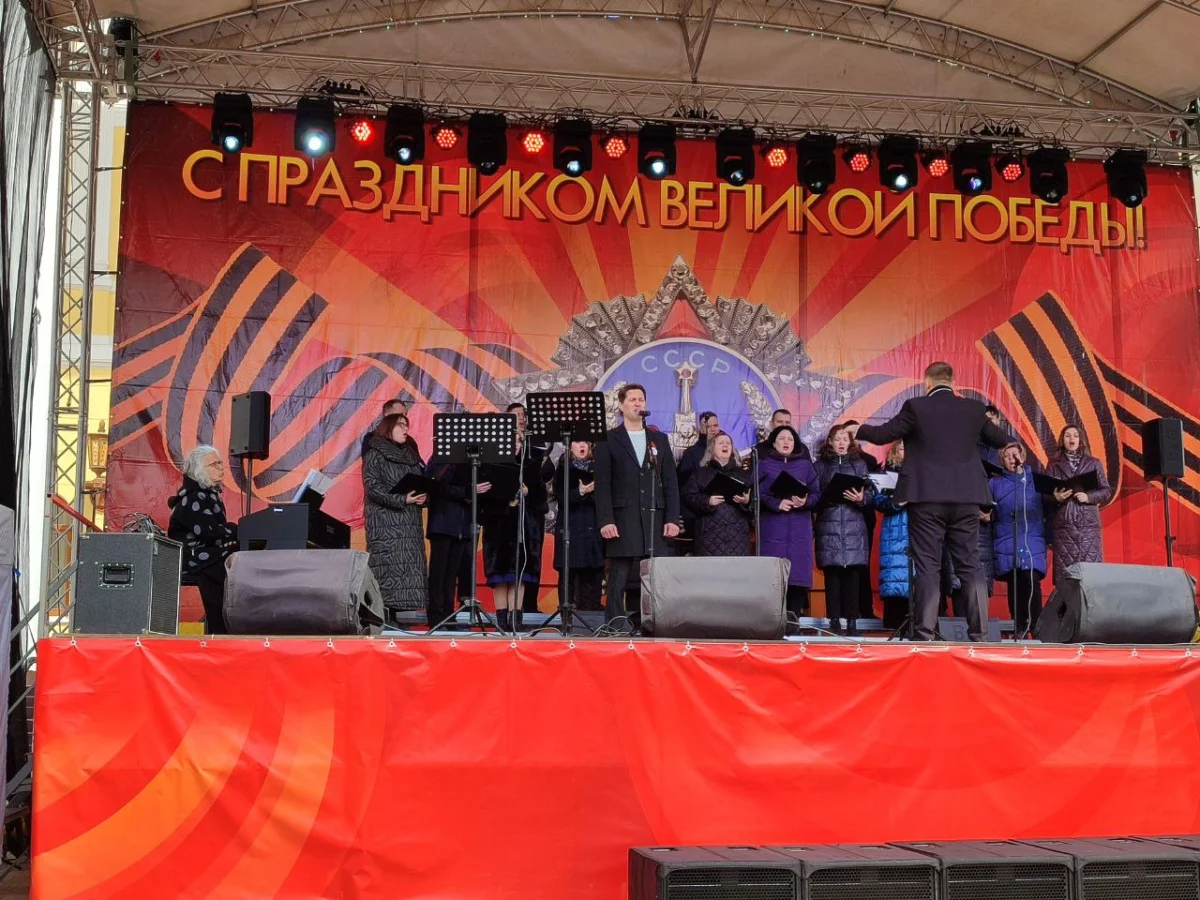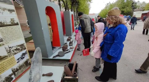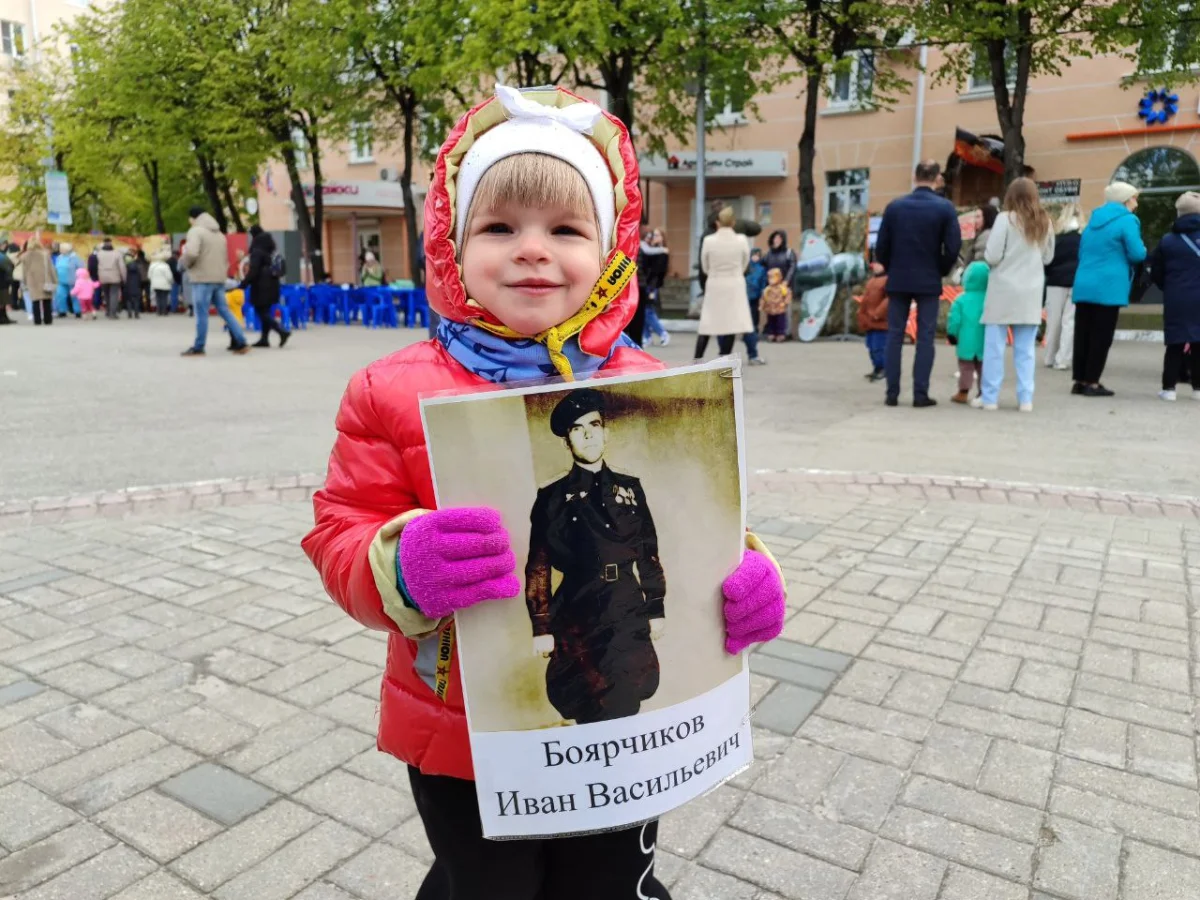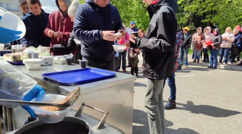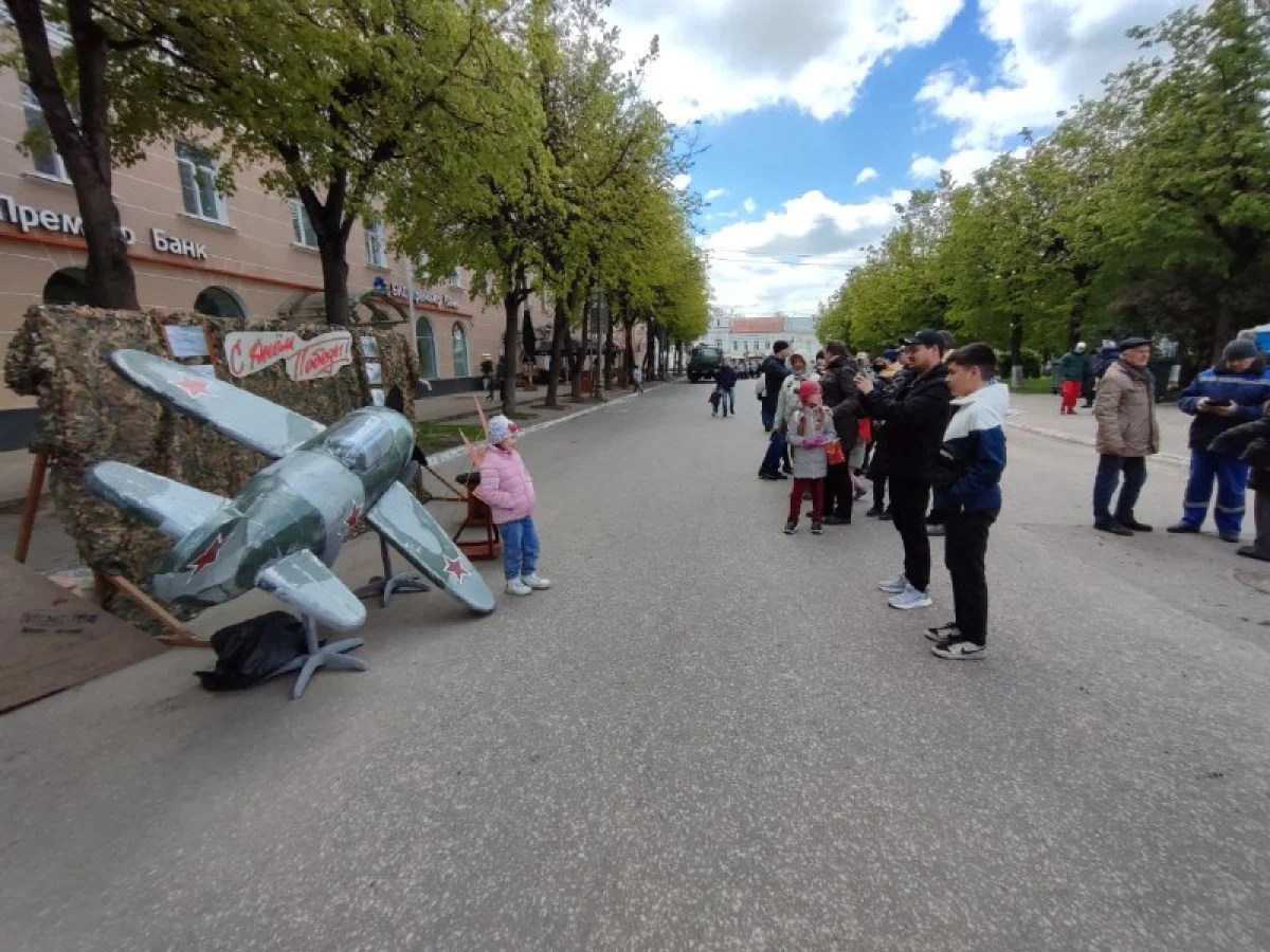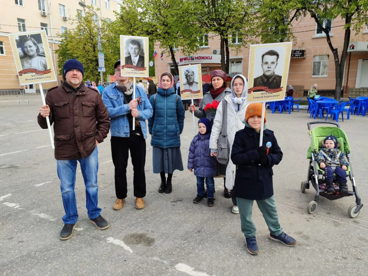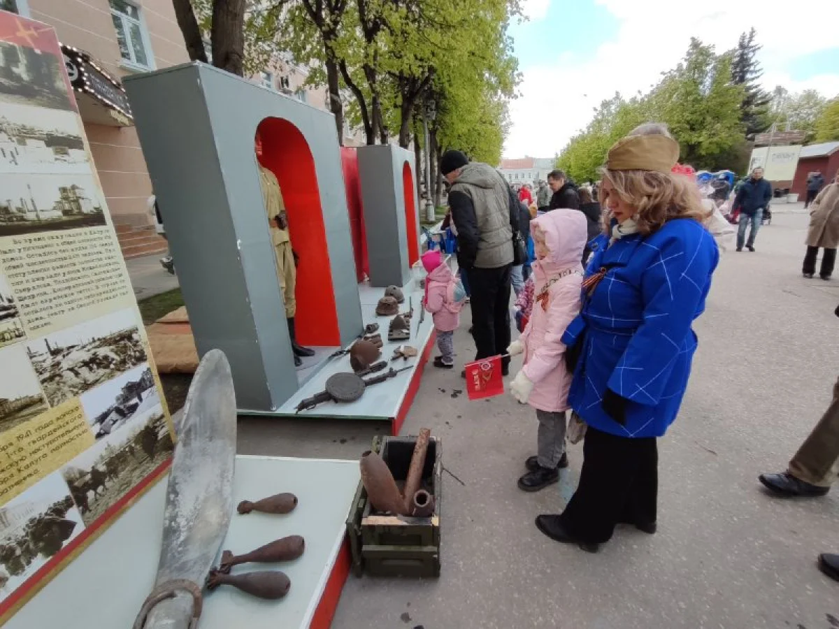Калужане пришли сюда семьями, принесли портреты своих родных - участников войны. Калужане смотрят выступления, выставки и посещают фотозоны. Танцевальные номера отменили из-за холода, а народ согревается горячей солдатской кашей.