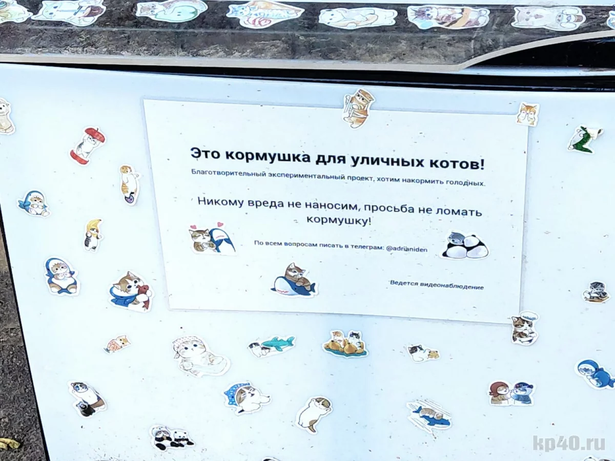 На кормушке повесили объявление с просьбой не ломать конструкцию.