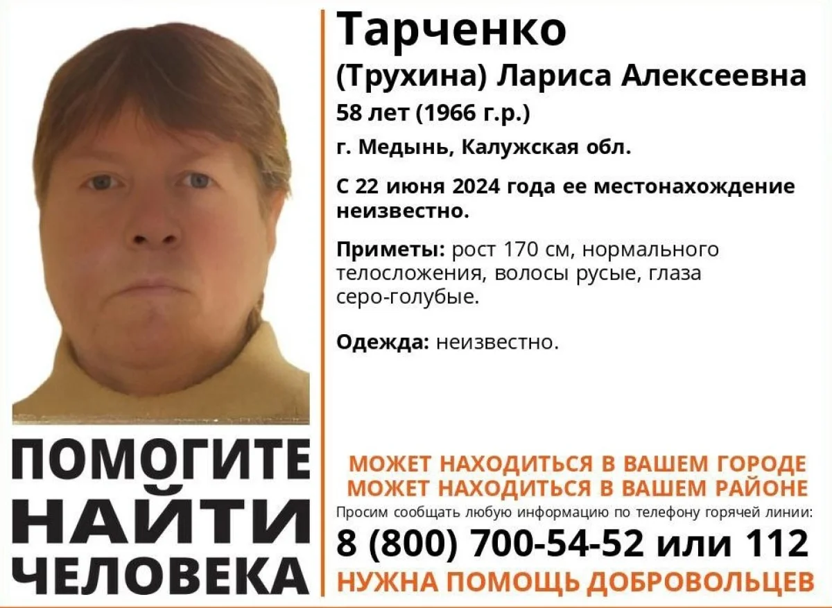 Во вторник, 2 июля, стало известно о пропаже 58-летней женщины в Медыни Калужской области. Об этом сообщают поисковики «Лизы Алерт».