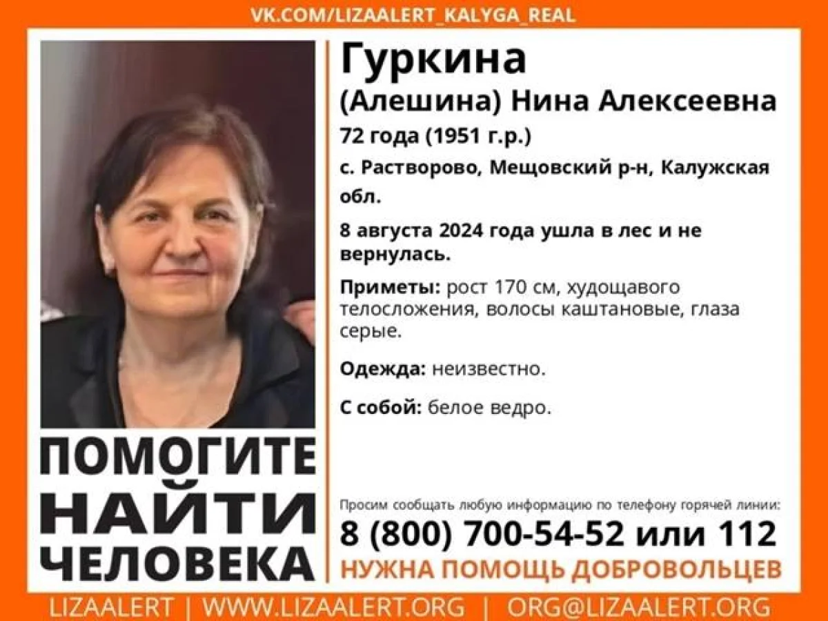 72-летняя Нина Гуркина пропала в селе Растворово Мещовского района. Женщина ушла в лес и не вернулась. Об этом информирует поисково-спасательный отряд "ЛизаАлерт".