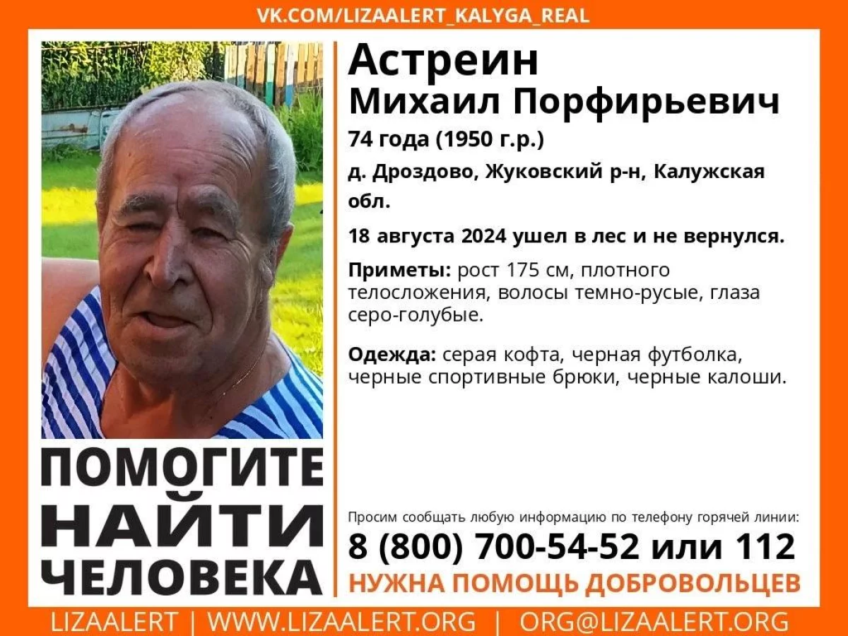 74-летний Михаил Астреин пропал в деревне Дроздово Жуковского района Калужской области. Об этом информирует поисково-спасательный отряд "ЛизаАлерт".