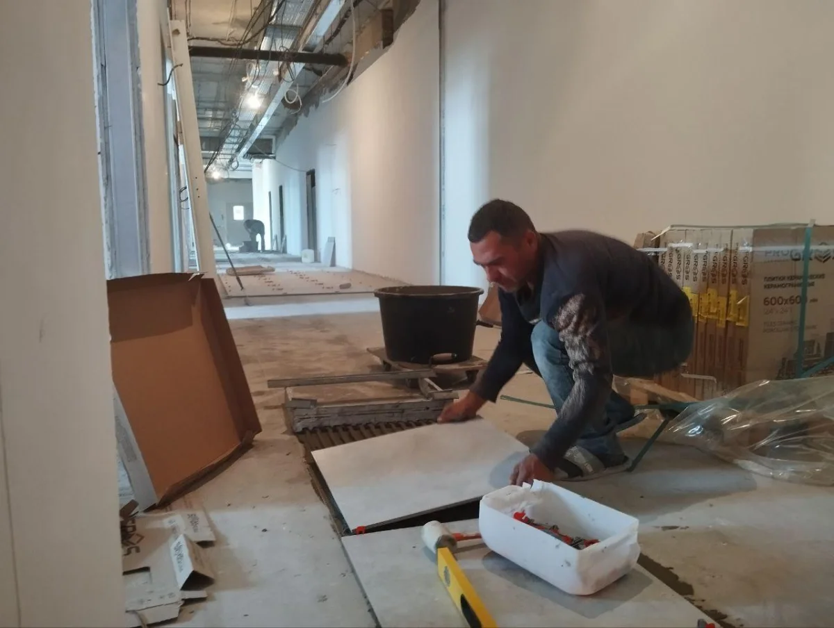 На финальном этапе и работа внутри здания – плитка и линолеум укладываются на лестницах и всех трех этажах поликлиники.