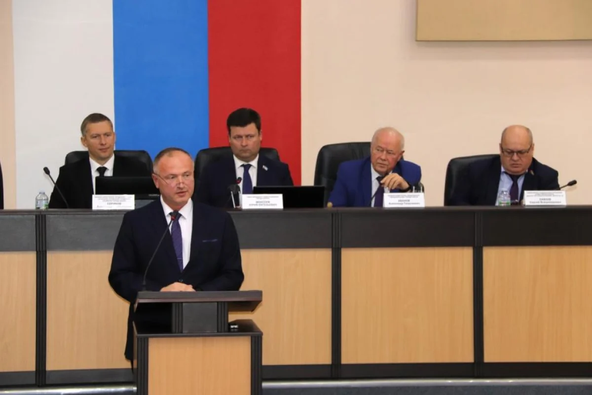 Избранный депутатом по 1-му избирательному округу Александр Артамонов принёс присягу, Юрий Моисеев вручил ему удостоверение и нагрудный знак, пожелал успехов в работе на благо Калуги и калужан.