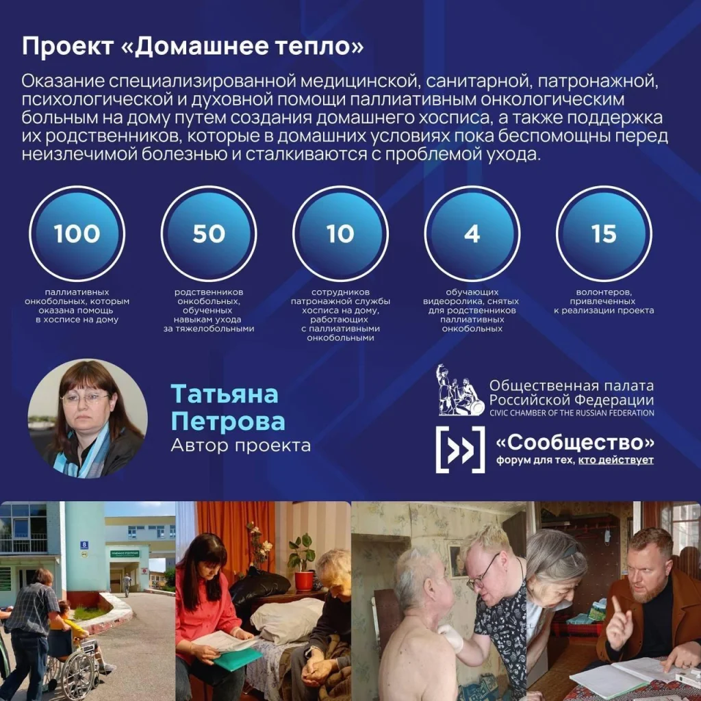 - «Домашнее тепло» — проект оказания помощи тяжелобольным людям от медицинской до духовной,
