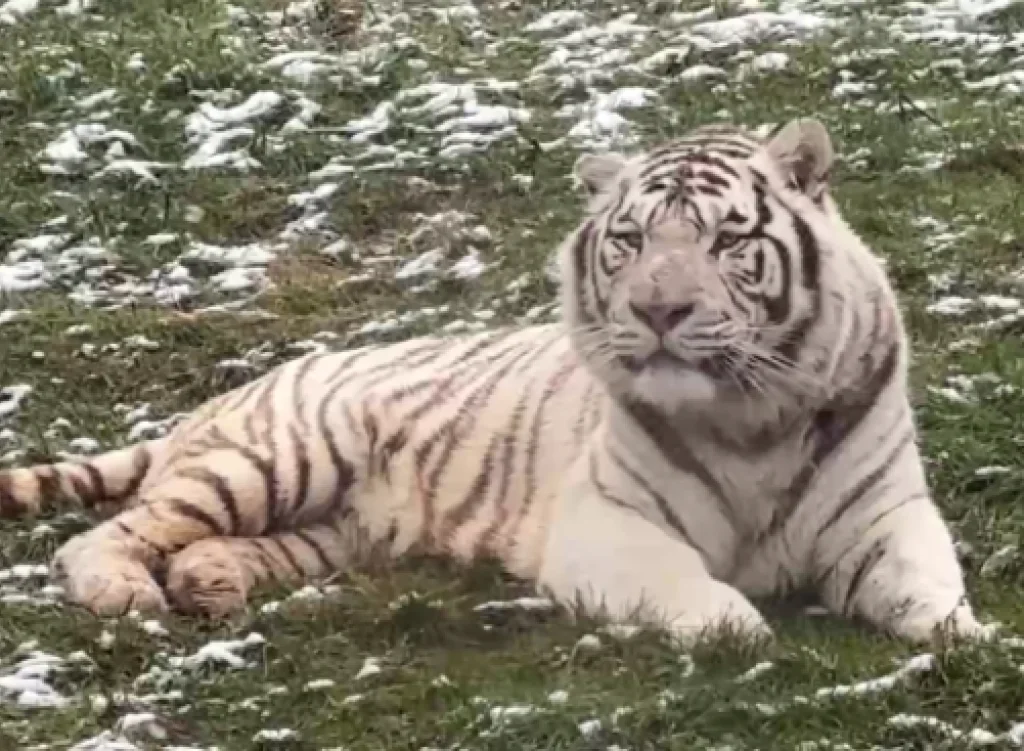 На этот раз работники запечатлели, как белый тигр Вагр созерцает окружающую обстановку под легким снегопадом.
