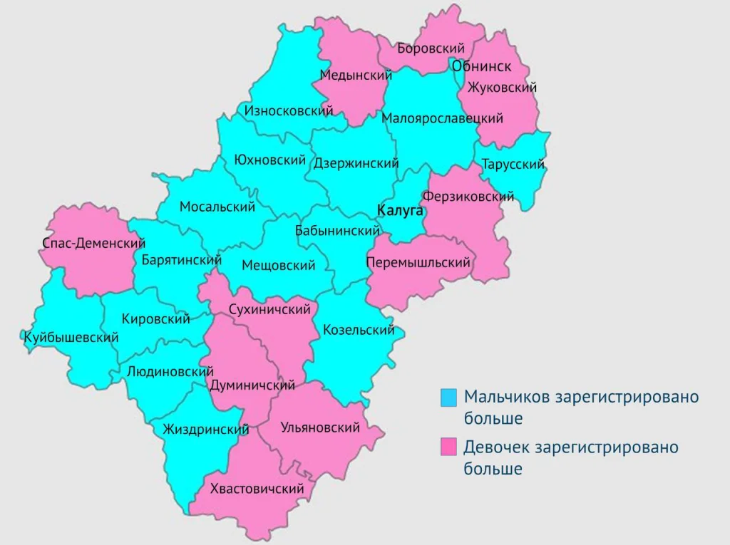 Однако есть 10 районов, где с самого начала девочек больше. В этот перечень вошли Боровский, Думиничский, Жуковский, Медынский, Перемышльский, Спас-Деменский, Сухиничский, Ферзиковский, Ульяновский и Хвастовичский.