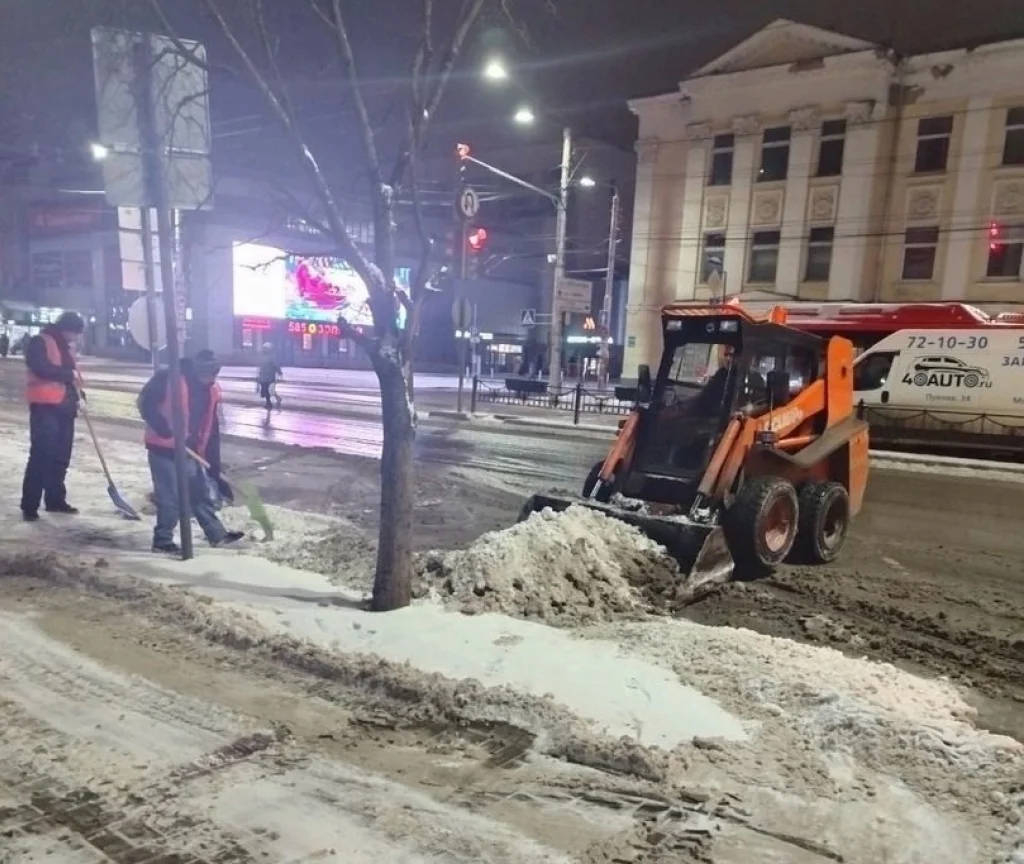 Убирают снег как вручную, так и с помощью крупной техники. Дороги и тротуары обрабатываются противогололедной смесью.