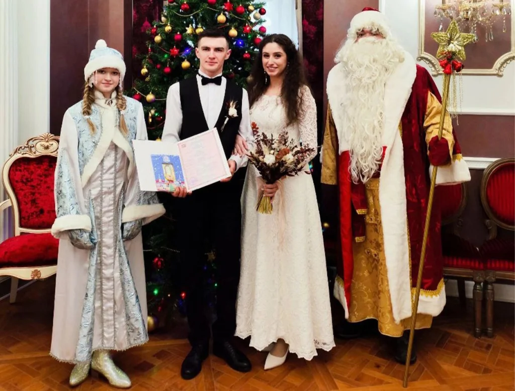 Молодоженов поздравляли Дед Мороз со Снегурочкой.