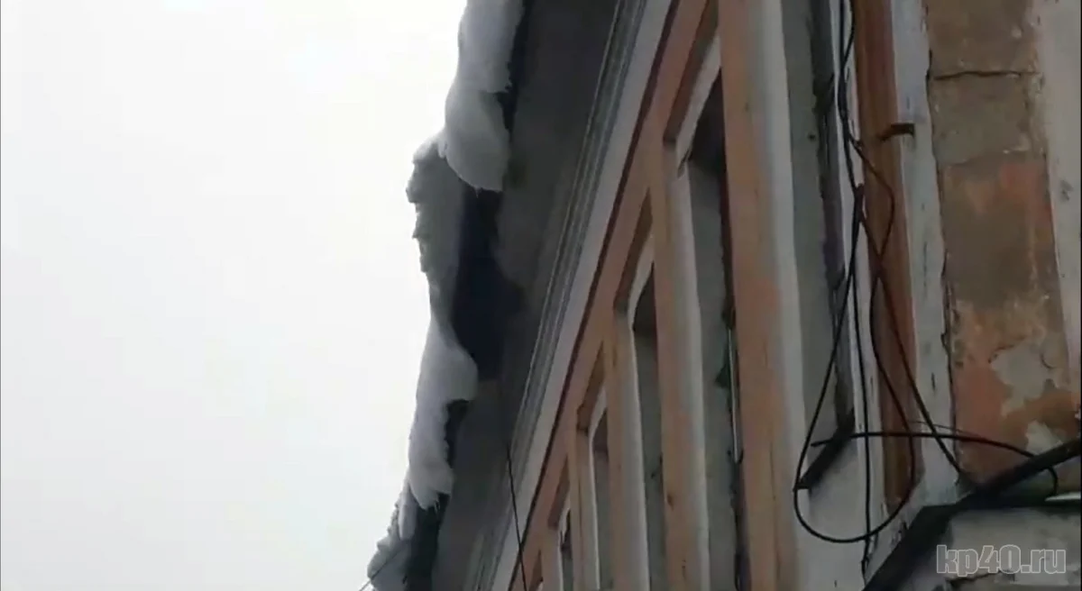 Снег и лед нависают с крыши над тротуаром с дома №4 на улице Никитина.