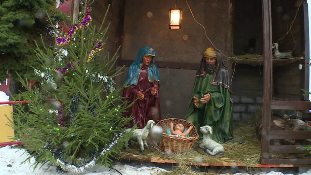 По традиции в канун Рождества перед православными храмами строят инсценированную пещеру с обязательными фигурками Иосифа, Марии и младенца Иисуса вокруг домашних животных.