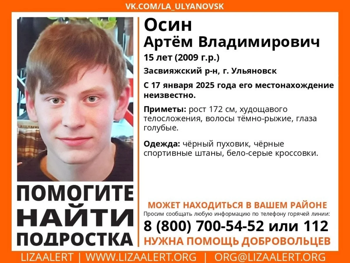 17 января в городе Ульяновск пропал Артём Осин. Он может находится в Калужской области. Об этом сообщили в поисково-спасательном отряде «ЛизаАлерт».