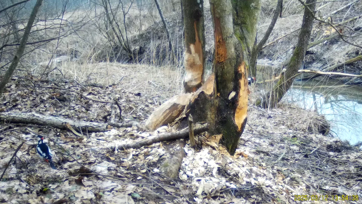 Фотоловушка на берегу маленькой лесной речки запечатлела, как по земле прыгает самец большого пёстрого дятла. Добравшись до лежащей на земле толстой ветки, он начинает ее долбить. А совсем рядом, по стволу погрызенного бобрами и подолбленного дятлами дерева, перемещается другой, более мелкий дятел – средний пёстрый.