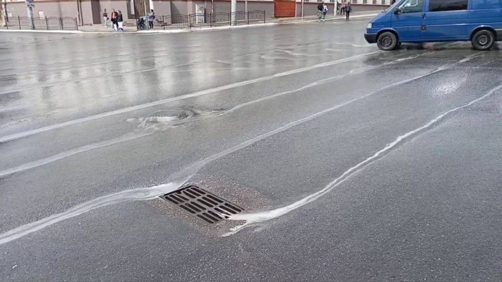 Судя по всему, дневной дождь смыл часть нанесенной недавно краски с бордюров и пешеходных переходов. По другой версии, это пыльца.