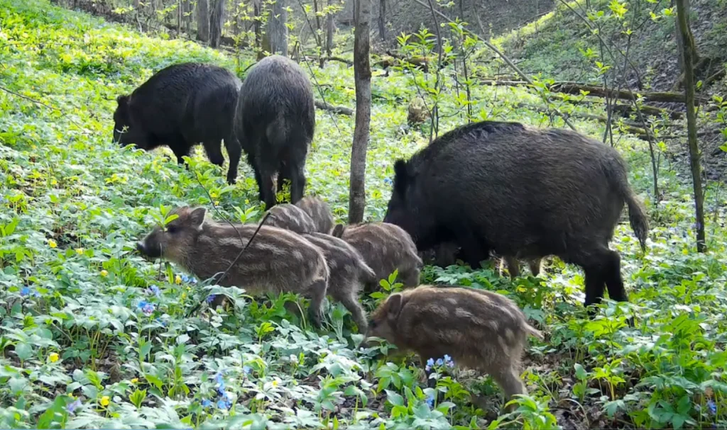 Камеры скрытого наблюдения зафиксировали трогательную сцену из жизни дикой природы: семью кабана с выводком поросят