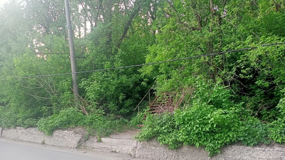 - Доброе утро. На ул. Карачевской д.№3 есть лестница, по которой дети ходят в школу каждый день. Когда были сильные ветра, видимо оторвался провод со столба и теперь висит очень низко, почти над головами. Это очень опасно. И ещё, на фото видно, какие заросли там. Когда выходишь с лестницы на проезжую часть, ничего не видно. Прошу опилить кустарники, так как это очень опасно.