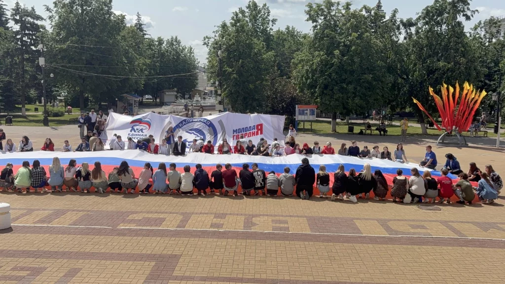 Более 150 человек развернули 50-метровый российский флаг и спели вместе патриотические песни.