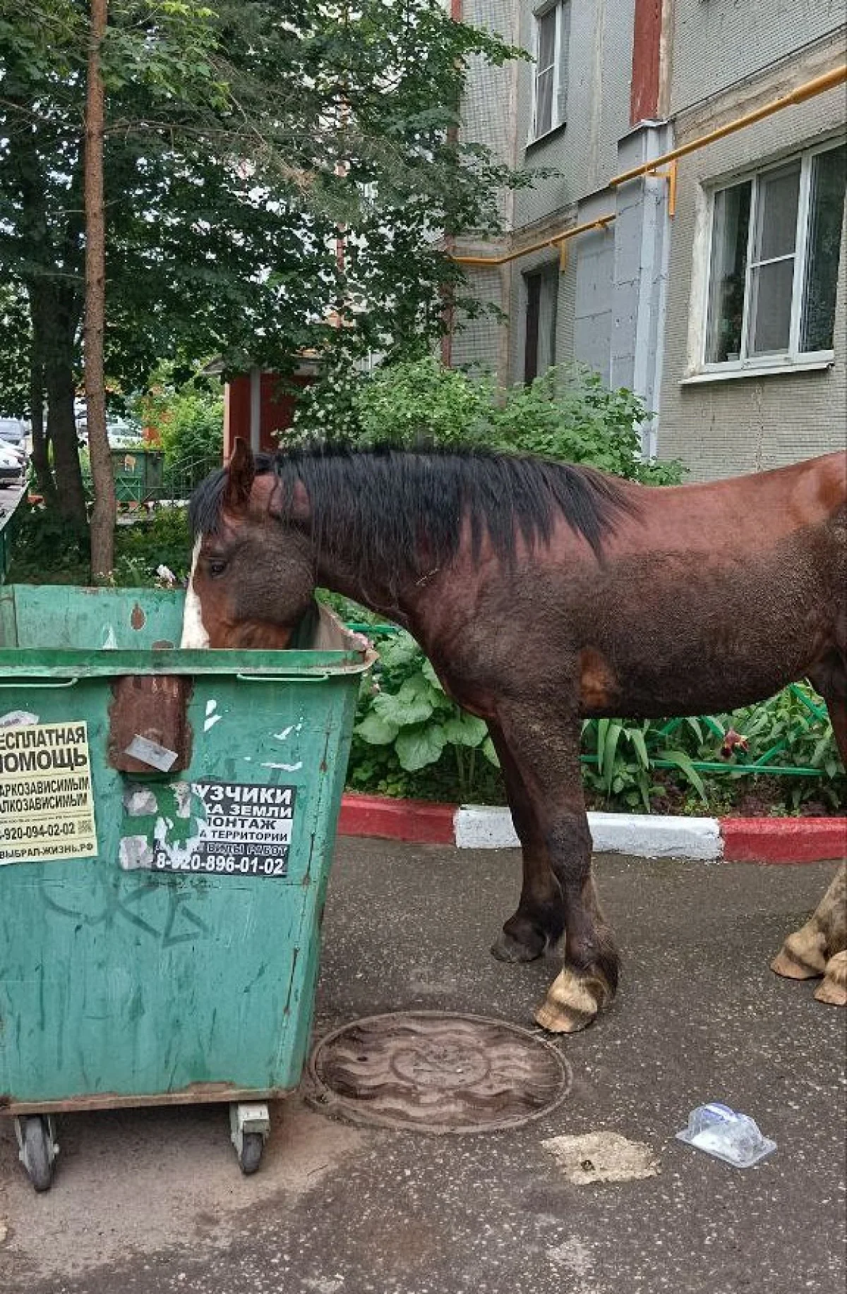 Фото выглядит так, будто это кадр из абсурдного кино: животное мирно жуёт у подъезда, словно здесь самое обычное место для конной прогулки.