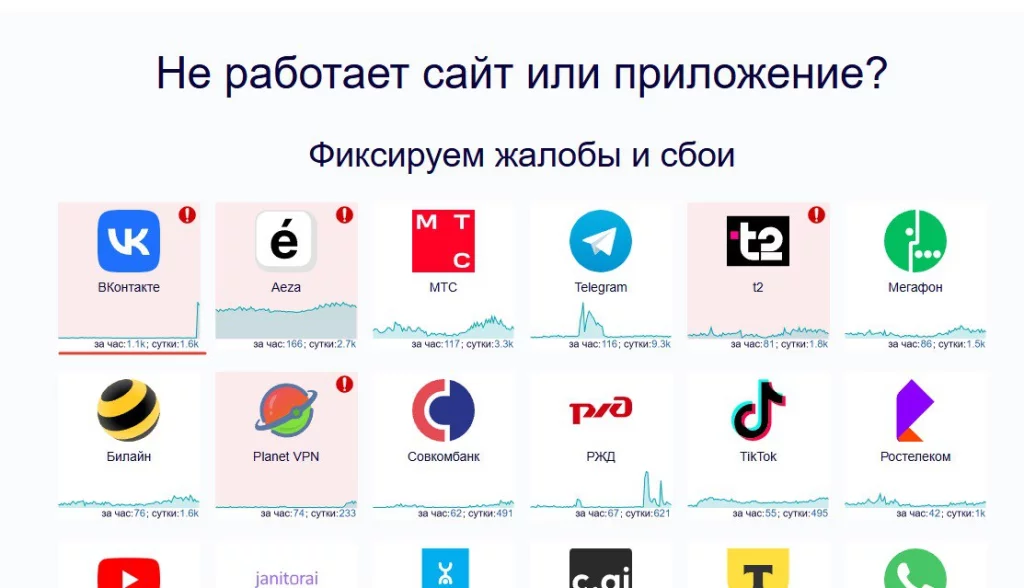 Как сообщает ресурс downdetector, который фиксирует жалобы на недоступность популярных сайтов, за сутки на сбои в ВК пожаловались 1600 человек, 1100 из них в последний час.