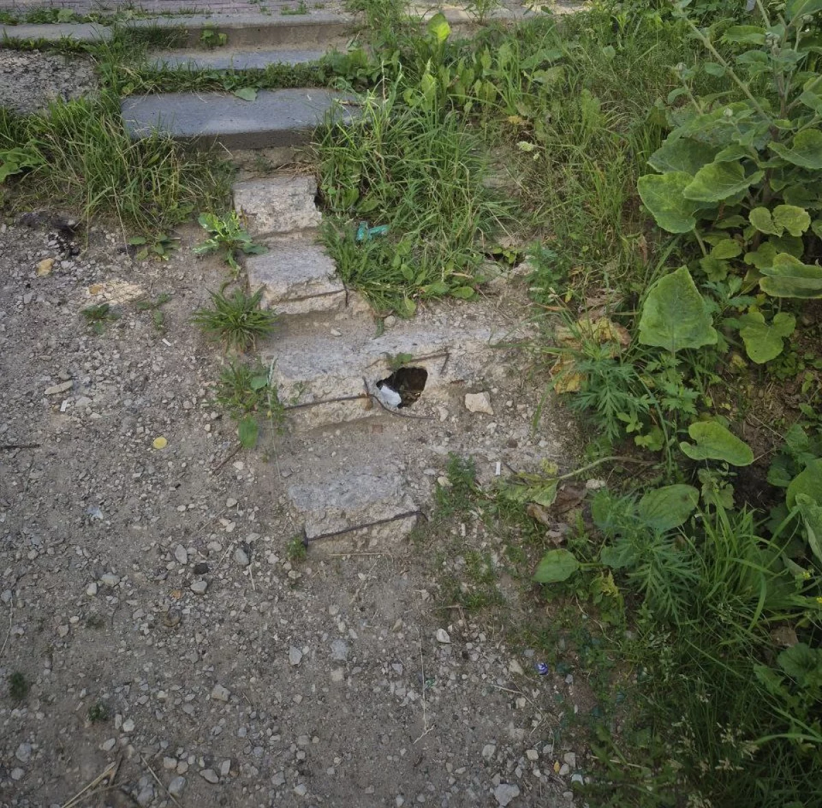 - Здравствуйте. Вот так выглядит выход со двора дома 25 по улице Ленина в сторону Машзавода. Это же не лестница, а «остатки какой-то древней цивилизации». Летом страшно споткнуться, а зимой вообще только на пятой точке спускаться.