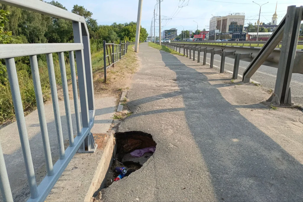 - На Гагаринском мосту размыло тротуар. Уже выглядит опасно, ещё немного, и туда будут проваливаться пешеходы и самокатчики.