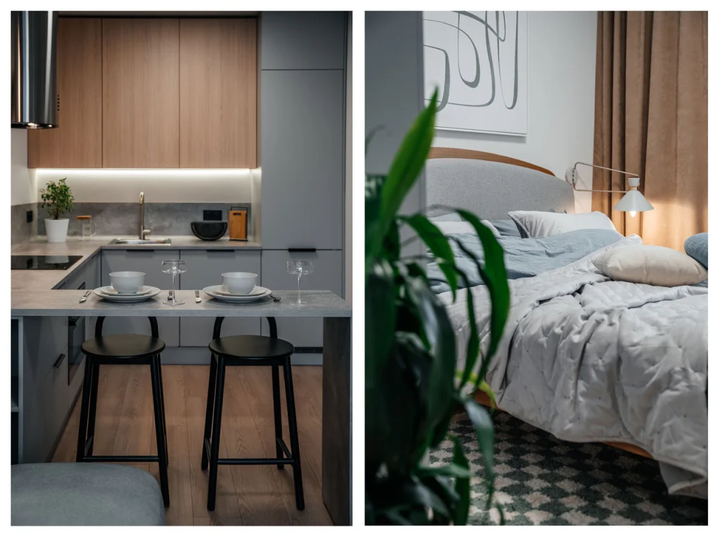 Шоурум представляет собой полностью обустроенную однокомнатную квартиру с современной европланировкой: просторной кухней-гостиной, светлой спальней и функциональным санузлом. Интерьер оформлен в нейтральной светлой гамме с использованием текстур дерева и камня.