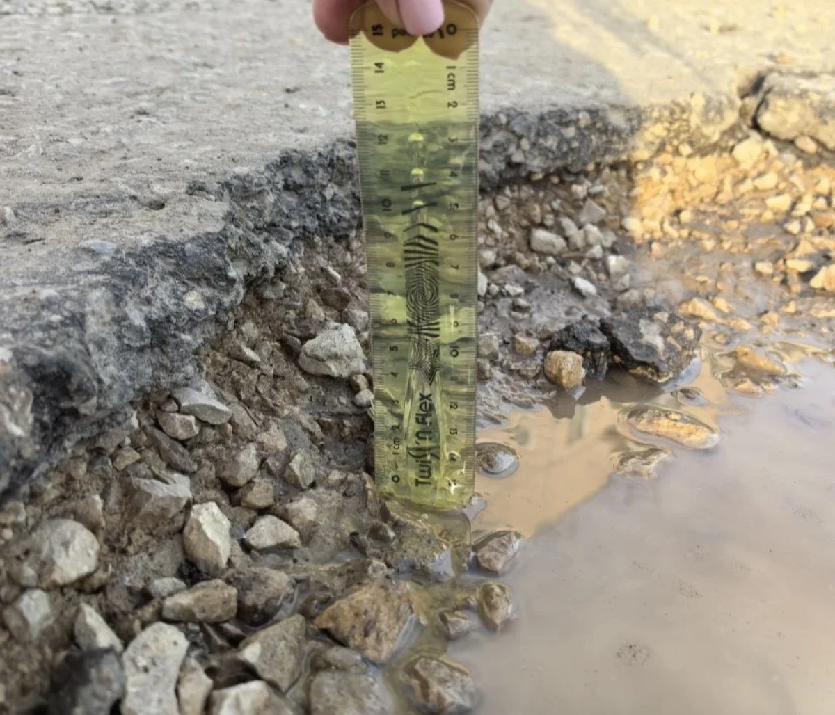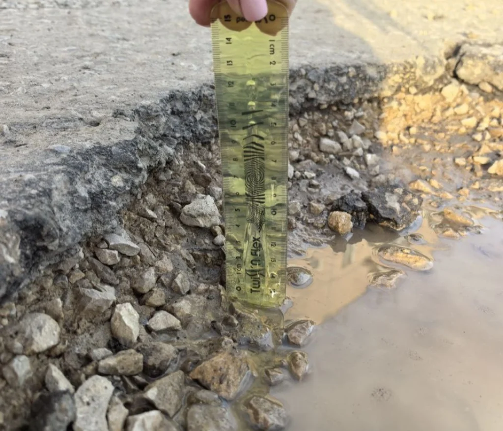 Но слова словами, а доказательства — доказательствами. К своему сообщению женщина приложила красноречивое фото. На снимке она с помощью линейки замеряет глубину ямы, которая на краю достигает 10-12 см, а в центре, судя по всему, все 15 см.