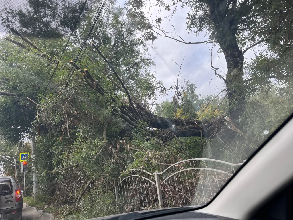На улице Московская, в районе дом № 242 по словам горожан с июля 2025 года на электрических проводах висит вырванное с корнем дерево.