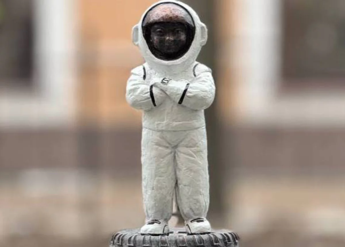 Этот космонавтик установлен рядом с офисным зданием за драмтеатром.