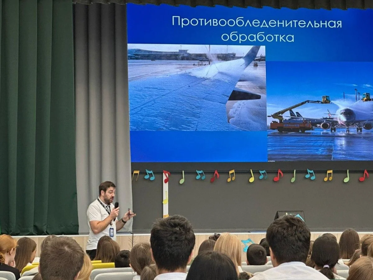 С ребятами встретился исполняющий обязанности начальника службы наземного обслуживания воздушных судов Иван Кривов. Он рассказал, как устроен ежедневный труд в аэропорту, какие профессии здесь востребованы и почему каждая роль - от диспетчера до техника - важна для безопасной и слаженной работы воздушной гавани. Школьники активно задавали вопросы: как начать карьеру в авиации, где учиться и какие качества нужны, чтобы преуспеть в этой сфере.