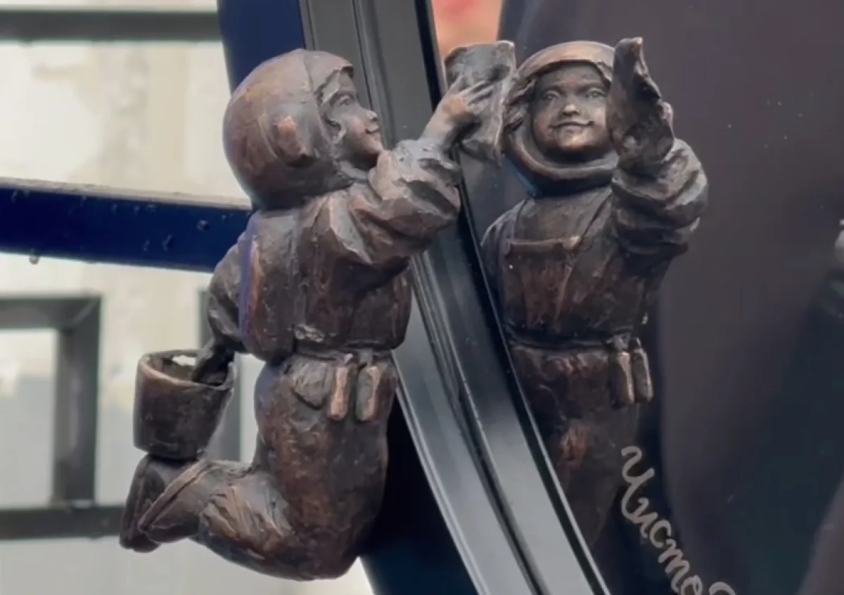 Это космонавтик-девушка, которая протирает большое зеркало. Фото опубликовала городская управа.