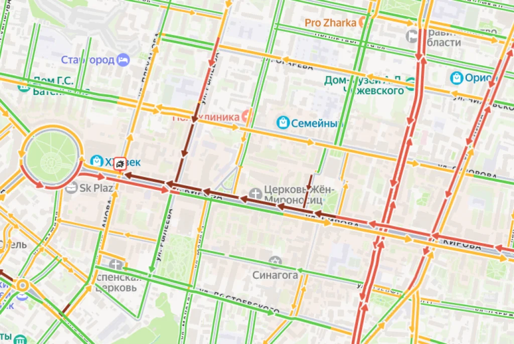 Очевидцы сообщают, что перекрыт средний ряд в сторону сквера Мира.