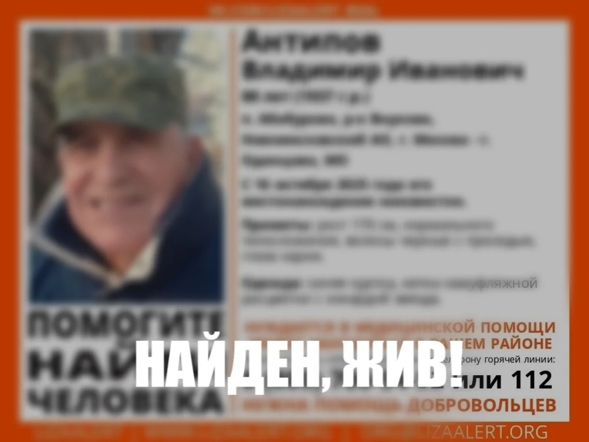 Удалось обнаружить живым 88-летнего Владимира Антипова из Московской области.